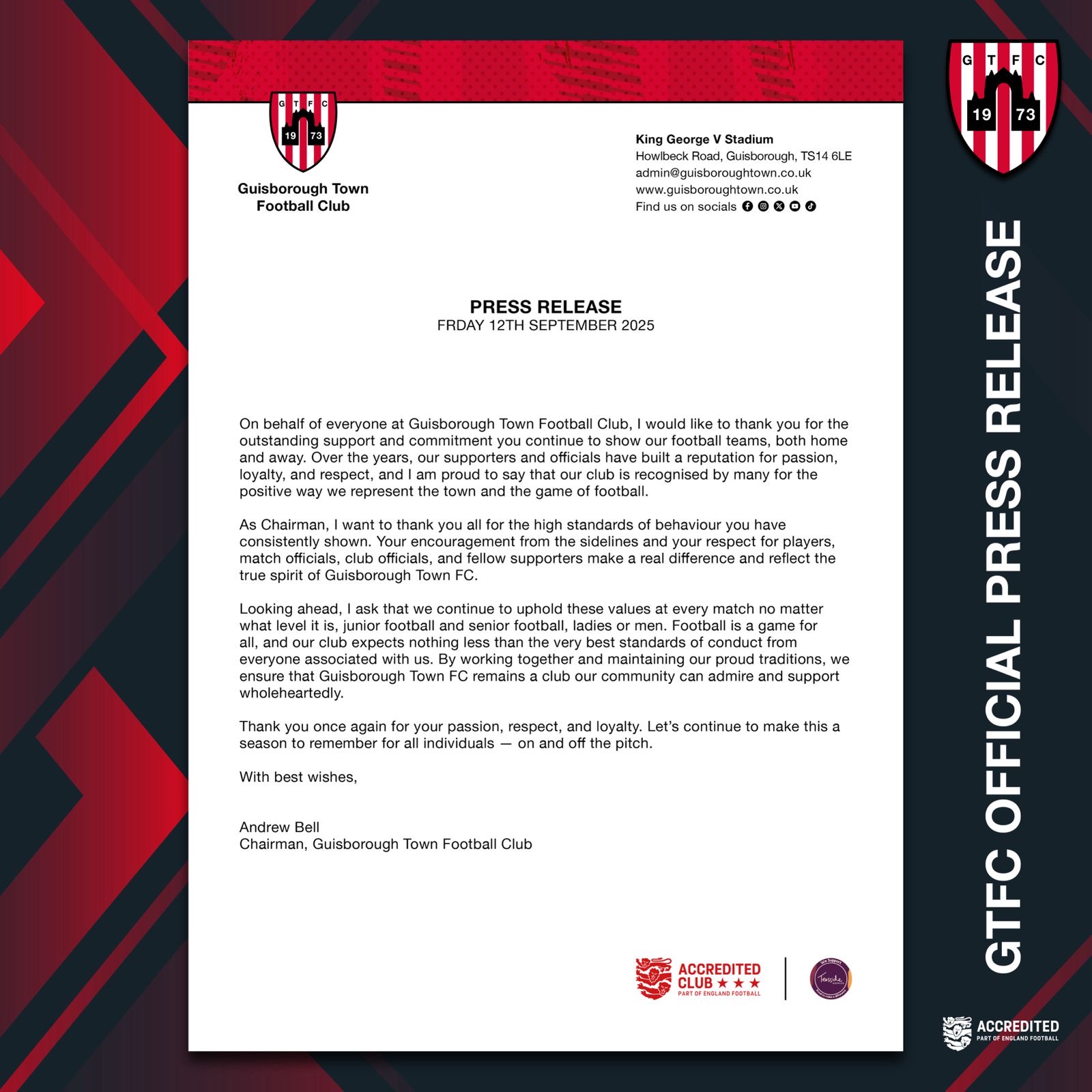 On behalf of everyone at Guisborough Town Football Club, I would like to thank you for the outstanding support and commitment you continue to show our football teams, both home and away. Over the years, our supporters and officials have built a reputation for passion, loyalty, and respect, and I am proud to say that our club is recognised by many for the positive way we represent the town and the game of football.
